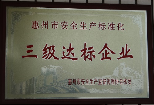 评为惠州市安全生产标准化三级达标企业